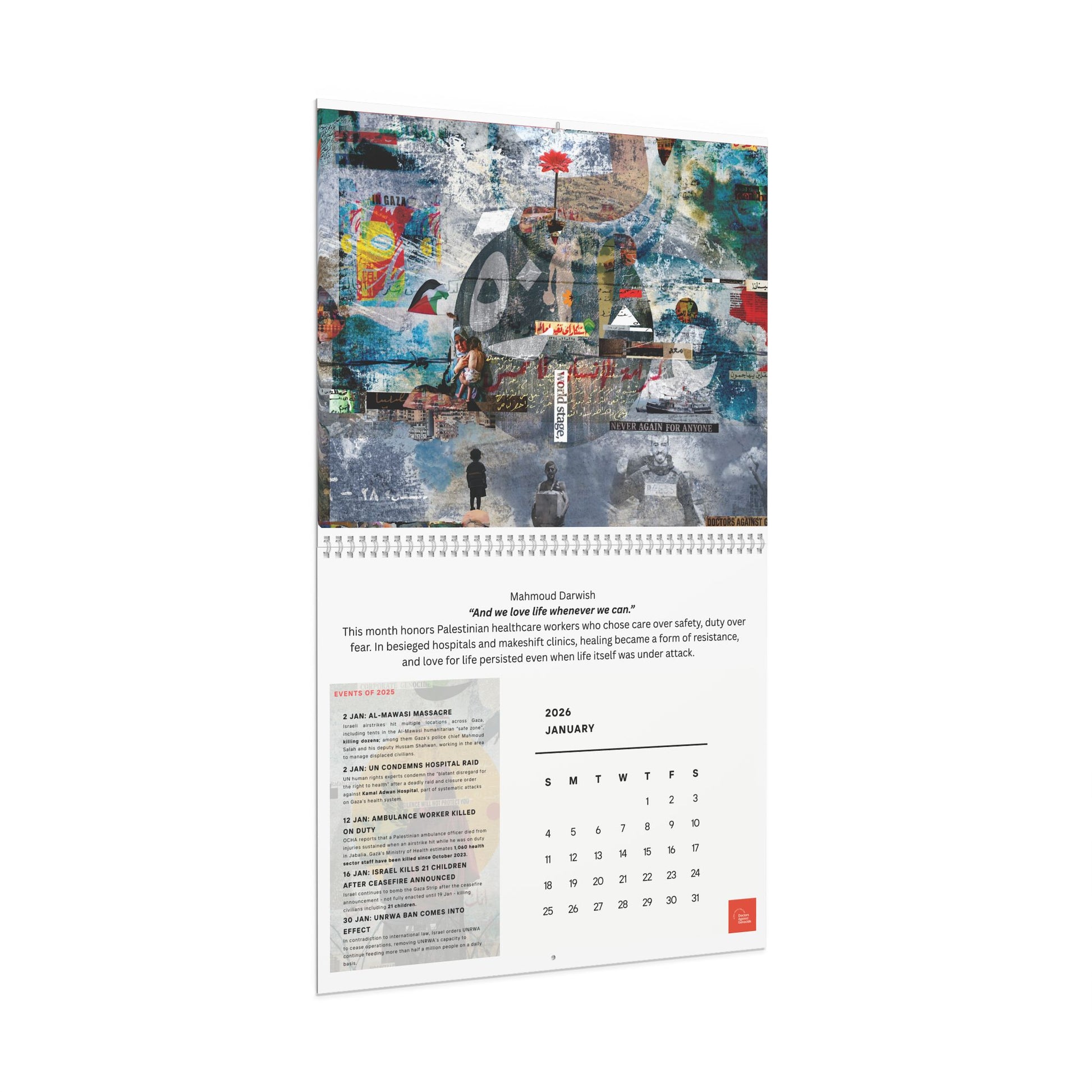 Each month centers a theme drawn from lived reality: healthcare under siege, journalists as witnesses, mothers and children, prisoners, famine, the destruction of hospitals and schools, and the persistence of hope amid genocide. The calendar weaves poetry by Mahmoud Darwish, Refaat Alareer, Fadwa Tuqan, Samih al-Qasim, and Ghassan Kanafani with carefully sourced timelines of events, grounding art in truth and remembrance